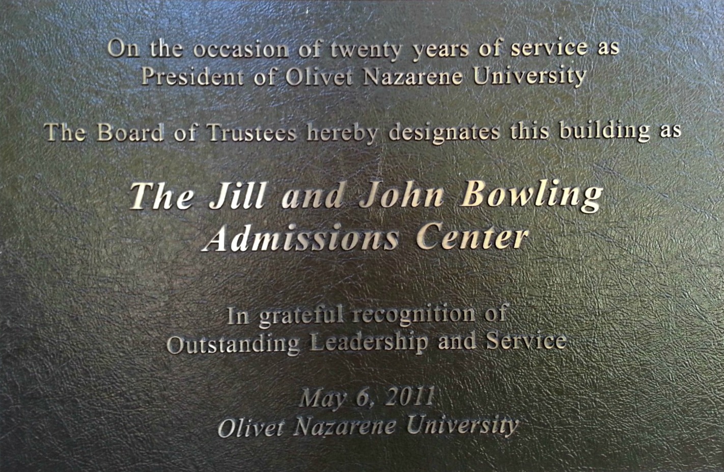 On May 6, 2011 the Admissions Center was designated the Jill and John Bowling Admissions Reception Center in 'grateful recognition' of 'outstanding leadership and service.'
